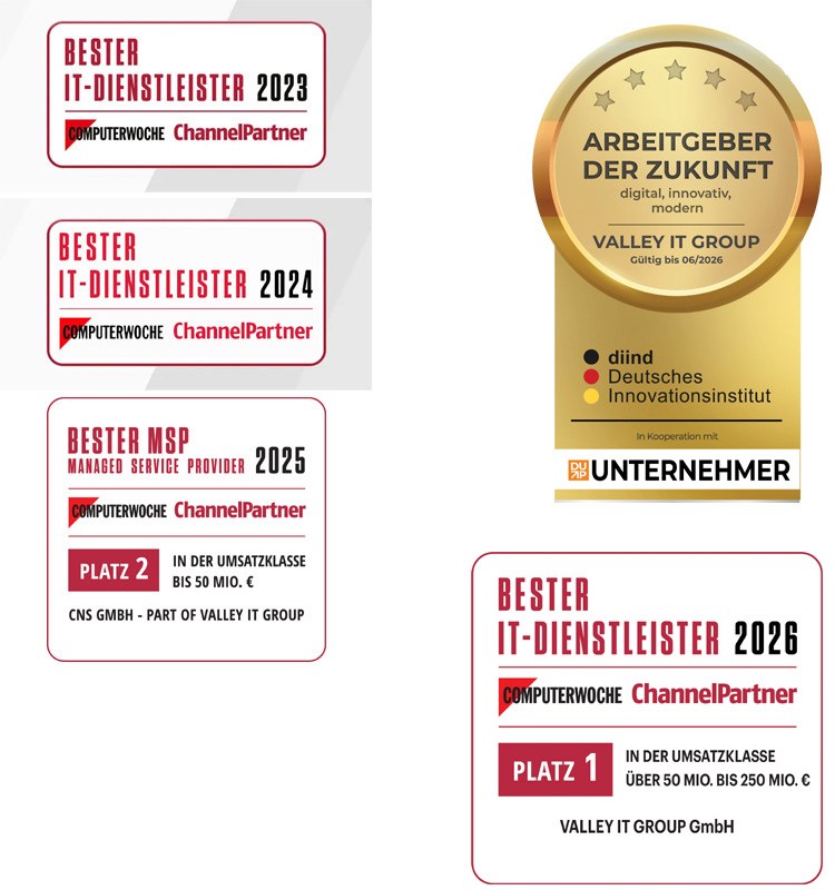 Als Teil der VALLEY IT GROUP bieten wir ein breites Produkt- und Dienstleistungsportfolio, das individuellen IT-Service mit hochmoderner IT-Sicherheit verbindet. Unsere strategischen Partnerschaften mit führenden Technologieanbietern, wie Microsoft, Sophos, Lenovo und Fujitsu, ermöglichen uns zu jeder Zeit, aktuelle und komplexe IT-Projekte professionell umzusetzen. Als DIN EN ISO 9001:2015 zertifiziertes Unternehmen erfüllen wir höchste Standards.